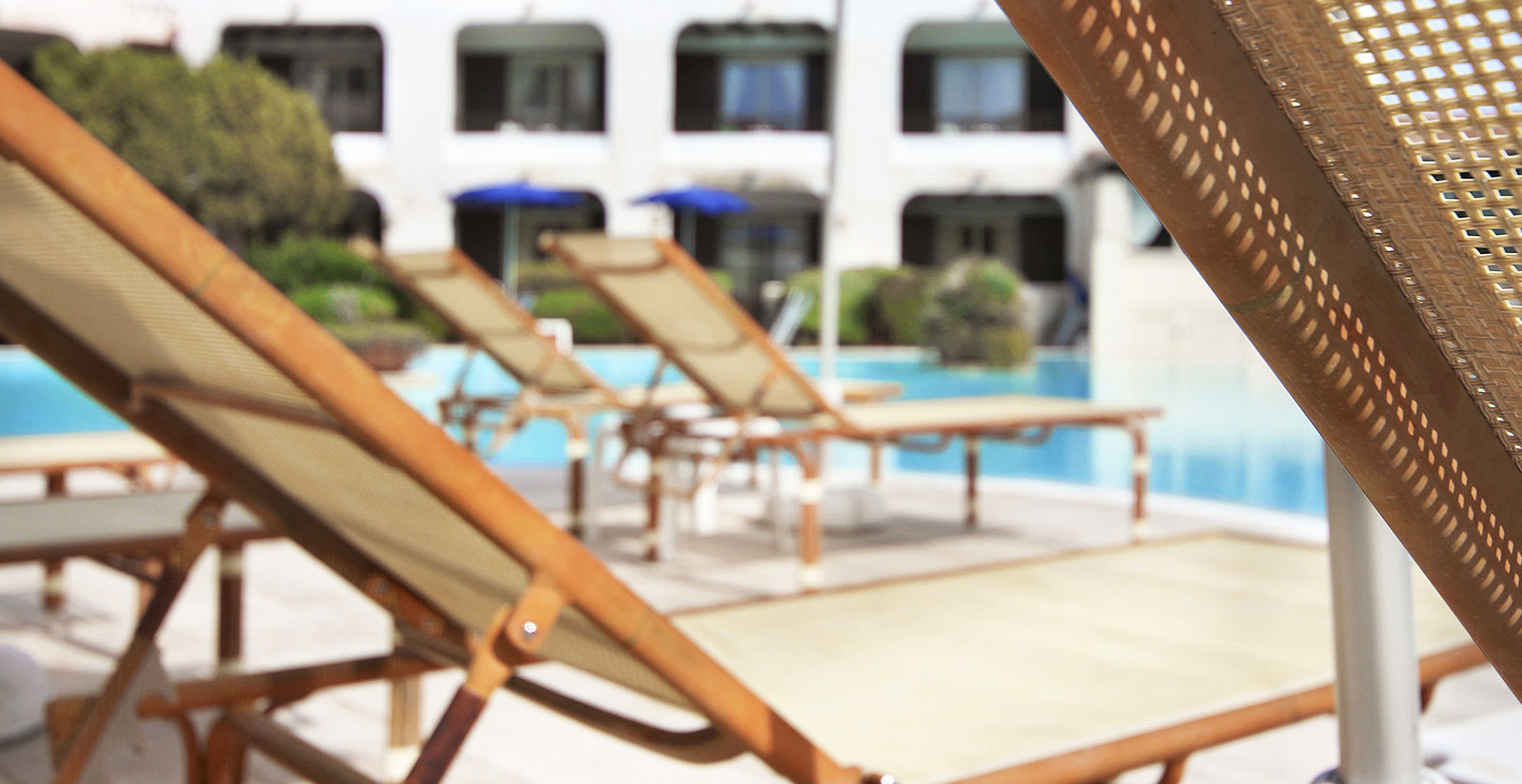 - Pool und Liegewiese mit Sonnenschirmen und Liegen